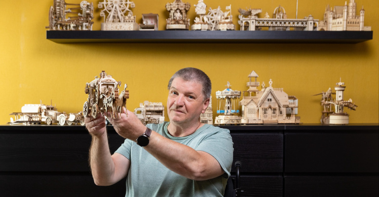 In de tijd dat Rob veel in het ziekenhuis ligt, heeft hij paniekaanvallen. “Ze gaven me toen als tip houten bouwpakketten te maken.” Hij laat er een aantal zien. Een kleine Notre Dame, Sint Pauls kathedraal, een hele gedetailleerde koets. Het hielp. Hij kon zich goed concentreren en was bezig. De proefpakketjes van het ziekenhuis waren destijds nog simpel. Rob verlegde de lat en ging er thuisgekomen mee verder. Op de slaapkamer pronkt het resultaat. Een jaar aan vele miniatuur bouwwerkjes. Van draaimolens tot robotspaarpotjes. Inclusief licht en beweging. “Soms ben ik binnen een paar uurtjes klaar, soms doe ik er dagen over. Ik heb er ook een aantal weggegeven, aan vrienden en familie.”
