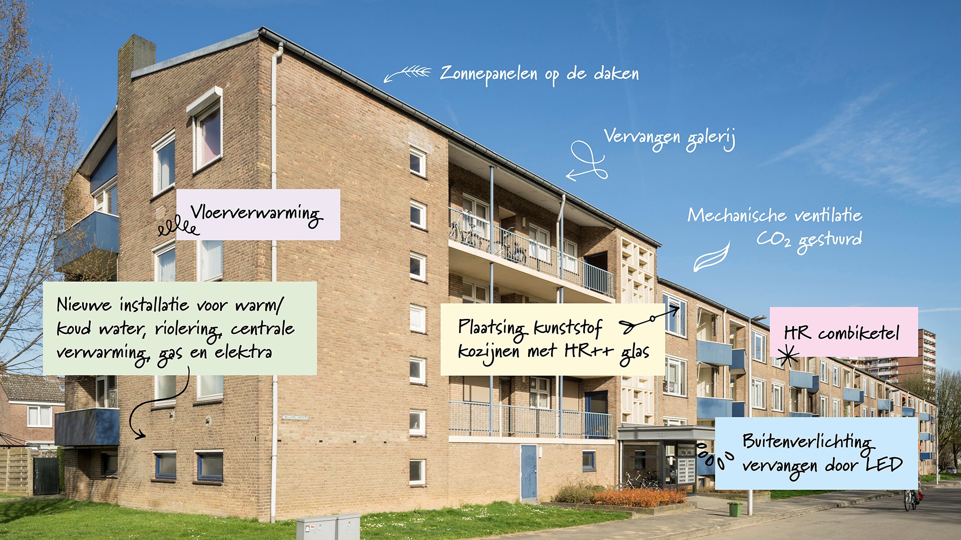Als het gaat om duurzaamheidsmaatregelen blijft het wikken en wegen. Zo werd bijvoorbeeld besloten af te zien van het gasloos maken van de woningen. Hoe zit dat? ‘Deze techniek is nog niet eerder toegepast bij renovatie’, aldus Vivian. ‘Bovendien wordt dit in het huidige energielabelsysteem afgestraft, omdat de energie-index stijgt en een deel van de subsidie daardoor verloren zou gaan. Ook voor huurders bleek het niet de beste keuze, omdat de PV zonnepanelen slechts voor 80% de elektriciteitsvraag kunnen opvangen. Met als gevolg dat de elektriciteitskosten zouden stijgen. Als de techniek verbeterd is, kunnen we deze achteraf alsnog toepassen. Daarnaast lopen ook de ontwikkelingen voor groen gas door, dus daar liggen ook nog kansen.’